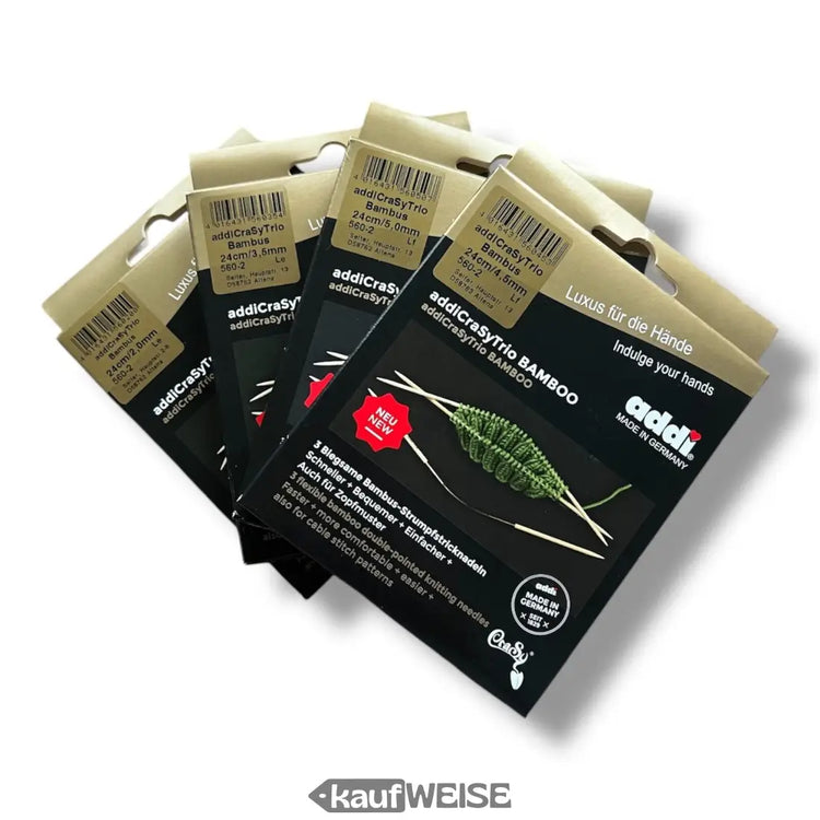 Ervaar een nieuw breigevoel met de addiCraSyTrio Bamboo Short! Gemaakt van hoogwaardige Japanse bamboe en met een fijne waslaag mits deze naaldenset de ideale keuze is voor iedereen die natuurlijke materialen En rustig breien liefde. De Tussenlengte van 24 cm is perfect voor zowel grote als kleine handen, vooral als je Sokken, beenwarmers of babykleding geef de voorkeur aan kortere naaldpunten. Kies uw gewenste maat vanaf 2,0 mm tot 5,0 mm!