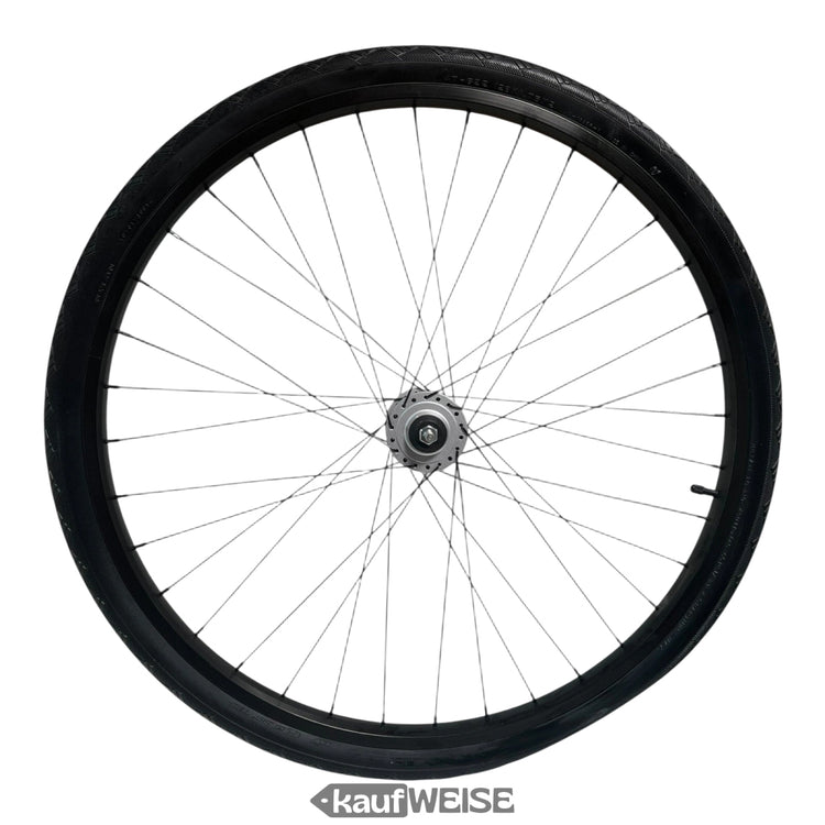 Om de overstap zo gemakkelijk mogelijk te maken, wordt deze hoogwaardige naafdynamo geleverd met een robuust 26-inch voorwiel . Dit is een zo goed als nieuw origineel onderdeel van de premiumfabrikant VanMoof, ontworpen voor duurzaamheid bij dagelijks gebruik. De band is eveneens reeds gemonteerd.